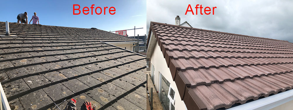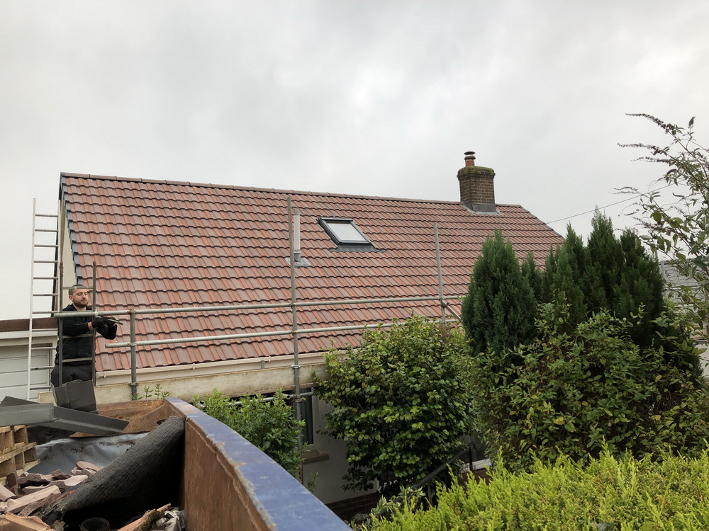 Roof was completely stripped of the old tiles, felt and batten then recovered with breathable membrane and 50mm x 25mm batten. New brown smooth face Redland Renowns were put on and individual dry verge fitted. A dry ridge system was used to finish off the roof.